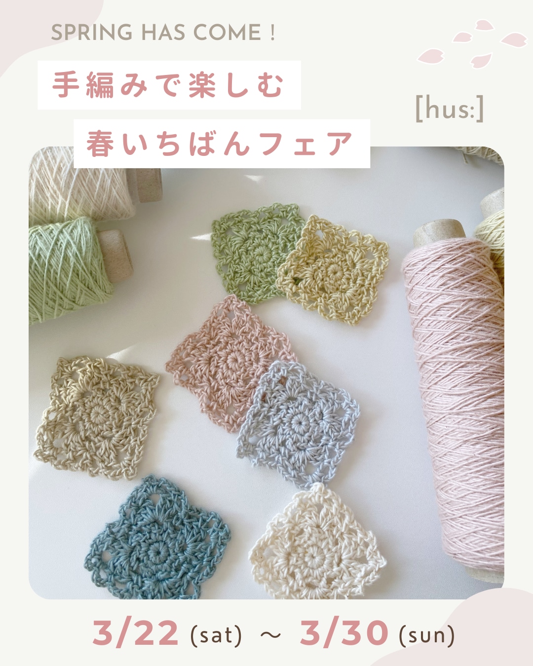[hus:]では、新しい季節に、新しい作品を編みはじめるワクワクを皆さんへお届けしたい!という想いで、3/22〜3/30の9日間、みなさんと一緒に春の編み物を楽しめるフェアを開催します! 期間中は、3,500円以上で「送料無料」、5,000円以上で「オリジナル毛糸小巻1個」、8,000円以上で「オリジナルジュートバッグ」をプレゼントさせていただきます。 オリジナルジュートバッグはシンプルなデザインなので、刺繍やモチーフなど、自分好みにアレンジしてみるのもおすすめです♪ シンプルなコーディネートにも、ぱっと華やかさを添えてくれる「お花モチーフのミニショール」。 大きめのお花モチーフが、あたたかな春の季節の装いにぴったりです。 かぎ針だけで気軽に編める簡単レシピで、大きめの作品でも意外と簡単に編めてしまうのが嬉しいポイントです。 繋げながら編み進めていく編み方で、少しづつショールらしい形に育っていく様子が楽しくて、どんどん編み進めたくなってしまいます。 コットン糸で編むショールは、ナチュラルで優しいおしゃれな雰囲気が素敵です。 夏の冷房対策にも活躍してくれる、頼れる1枚になってくれそう。 あたたかな季節にワクワクを運んでくれる、おしゃれな印象のミニショールを、優しい春の景色を楽しみながら編んでみても良いですね。 「お花モチーフのミニショール」はこちら コーディネートの印象をがらりと変えてくれる、美しいシルエットが魅力の「ムームのベスト」。 シンプルな編み方だけで、四角いパーツを4つ繋げて作るウエアなら、初めてのウエア編みでも意外と簡単に編めてしまうのも嬉しいですね。 どんなコーディネートにもしっくり馴染んでくれる、ナチュラルで優しい雰囲気のベストは、春夏に活躍してくれる頼れる一着になってくれそうです。 紡毛糸のさらりと柔らかな肌触りを楽しみながら編む、着心地も触り心地も良い手編みウエア「ムームのスクエアベスト」。 これからの季節にぴったりの素敵なベストを編んで、春気分を満喫してみてはいかがでしょうか。 「ムームのスクエアベスト」はこちら 「リラックスモードで気軽に着られるごきげんな日常着」をコンセプトに作られた、「gokigen_hoodie」。 肩の力を抜いていつでも気軽に着回せるフーディーは、春のお出かけにぴったりの鮮やかな色合いで、コーディネートをぱっと明るく元気な印象にしてくれます。 どんなコーディネートをしようかと考えながら、とっておきのオーダーメイドフーディーに仕上げることができますね。 手編みウエアの中でもカジュアルな雰囲気のフード付きデザインで、いつもとちょっと気分を変えたウエア編みが楽しめそうです。 頭を空っぽにして無心で編めるシンプルな編み地で、編んでいる時間がゆったりと優しいひと時に。 優しく美しい色合いの糸を使った、カジュアルな雰囲気のフーディーは、大人の余裕が感じられるおしゃれな印象です。 いつかは挑戦してみたいと思うウエア編み。 可愛らしい春色の糸を手に取って、おしゃれなウエア編みに挑戦してみてはいかがでしょうか。 「gokigen_hoodie」はこちら。 田舎の田園風景を思わせる、ゆったりとした雰囲気が魅力の「のどかなブランケット」。 ナチュラルな雰囲気の模様編みが、初心者さんにも楽しく編める簡単レシピで、棒針編みの基本、表目と裏目だけで編めてしまいます。 これから編み物を始める方、始めて間もない方にもおすすめ。 SORA16さんのシンプルでおしゃれなデザインと、[hus:]糸のナチュラルで優しい雰囲気がマッチした、とっても素敵なブランケットがキットなら気軽に編み始められてしまいます。 春のあたたかな風を感じながら、ゆったりとした気分で手編みブランケットを編んでみてはいかがでしょうか。 「のどかなブランケット」はこちら ふんわりと柔らかな肌触りが魅力の、STANDARD COTTON「Fuwari ふわり」。 コットン糸のさらりと爽やかな質感と、カシミヤのようにしっとり柔らかな風合いのいいとこ取りをしたような、極上の触り心地が魅力のコットン糸です。 かぎ針 8/0〜10/0号、棒針 12〜14号に対応した、少し太めのコットン100%の糸は、柔らかな触りが心地良く、編んでいる時間もゆったりと優しい気持ちで、素敵な手編み作品が編めてしまいます。 「Fuwari ふわり」の肌触りの良さを活かし、ウェア、クッションカバー、ブランケットなど、肌に直接触れる作品編みにもぴったり。 編みながら思わず顔を埋めたくなってしまうほど極上の肌触りは、まるでカシミヤのように優しくしっとりとした編み地に仕上がります。 肌触りの良さを活かした、ナチュラルで優しい印象の「きなり」色は、シンプルな色だからこそ、糸の質感が引き立つ素敵な作品が編めそう。 春夏に編みたくなるコットン糸の、極上の肌触りを感じながら、とっておきの作品編みを楽しんでみてくださいね。 「Fuwari ふわり」はこちら ナチュラルカラーの糸とカラフルな糸をくるくると撚り合わせた、 Fa