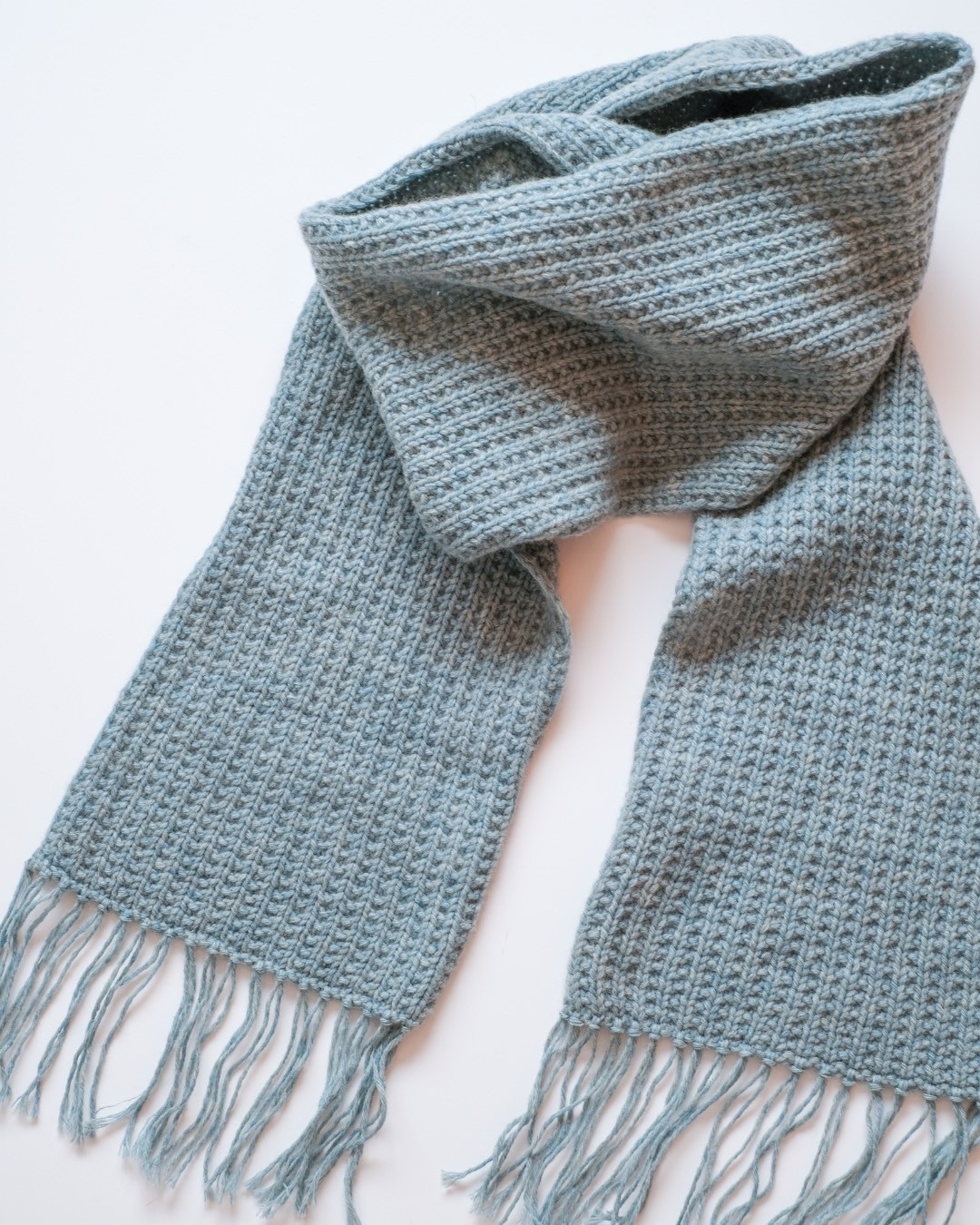 natsuki knit.さんのリバーシブルマフラーを、[hus:]オリジナル糸「テディ」に合わせてリメイクした「テディで編むリバーシブルマフラー」。