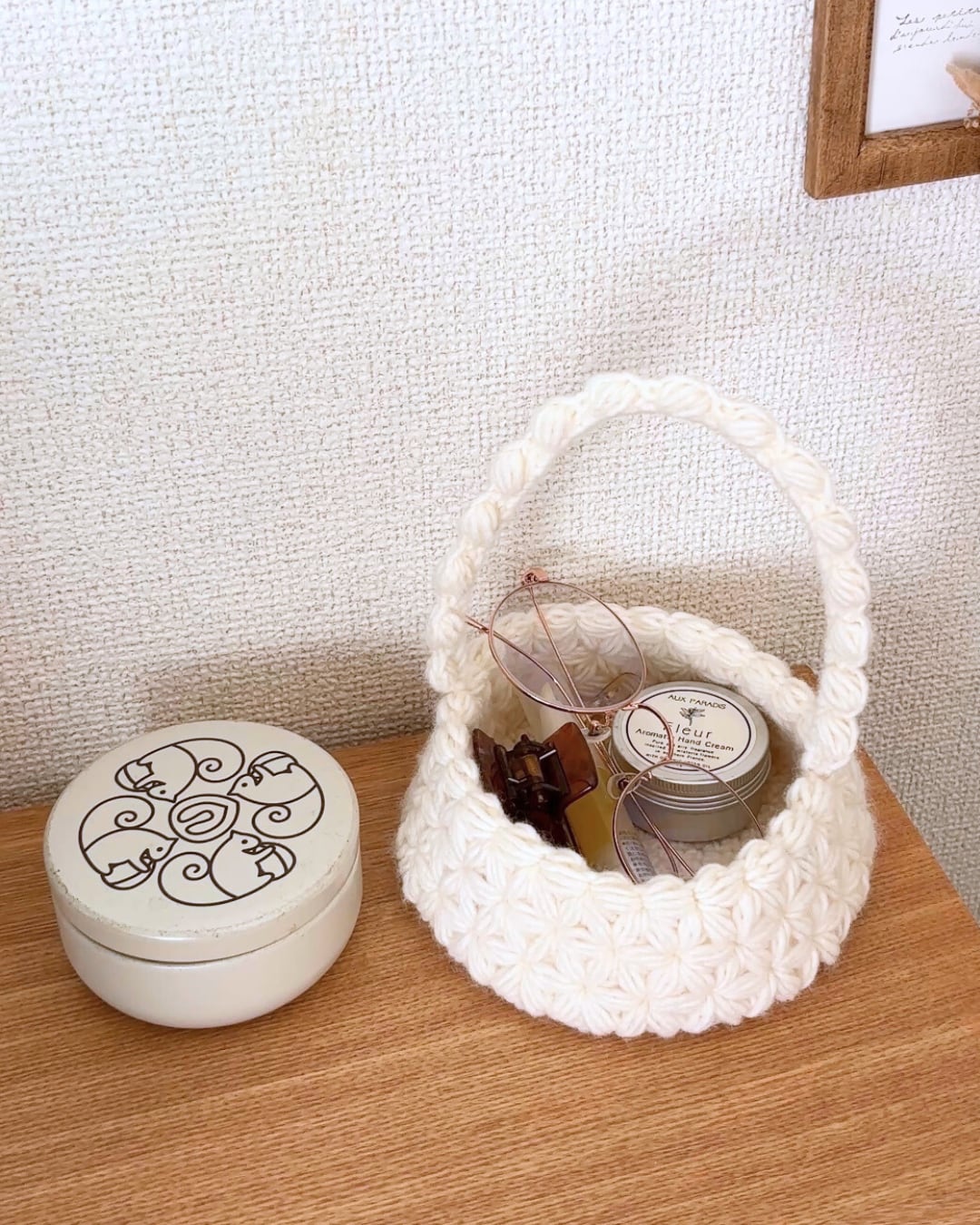 ふっくら立体的なお花のような模様が並ぶリフ編みバスケットです。