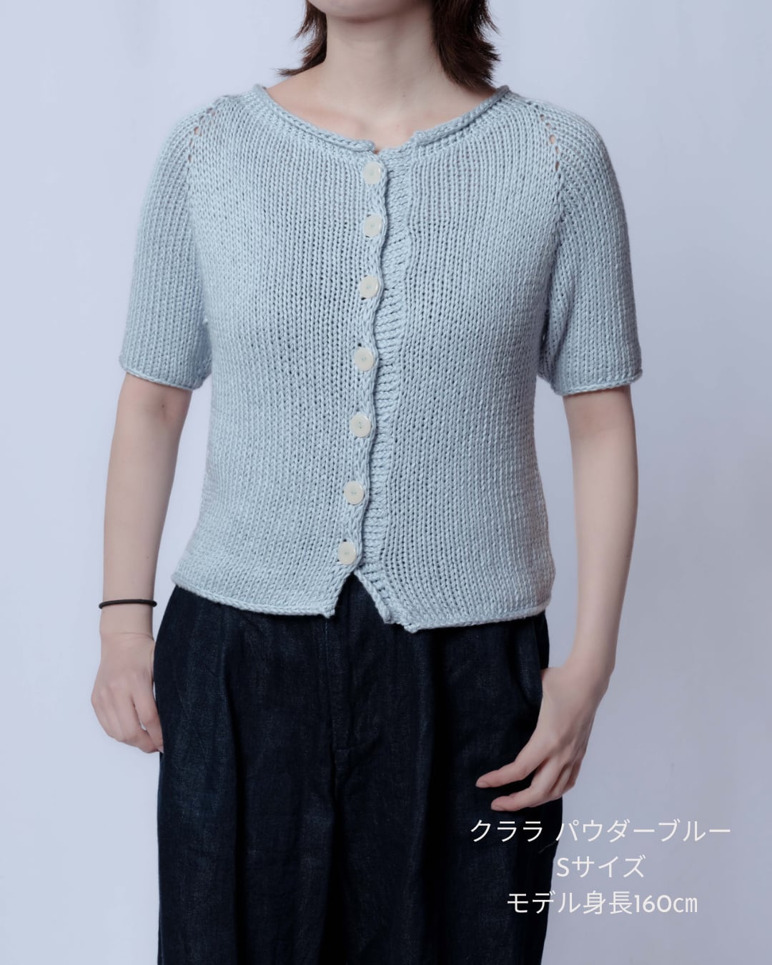 形に一癖あり、着る人にゆだねるようなデザインが好きなので、自由に着て手編みを楽しんでいただけたらと思っています。
