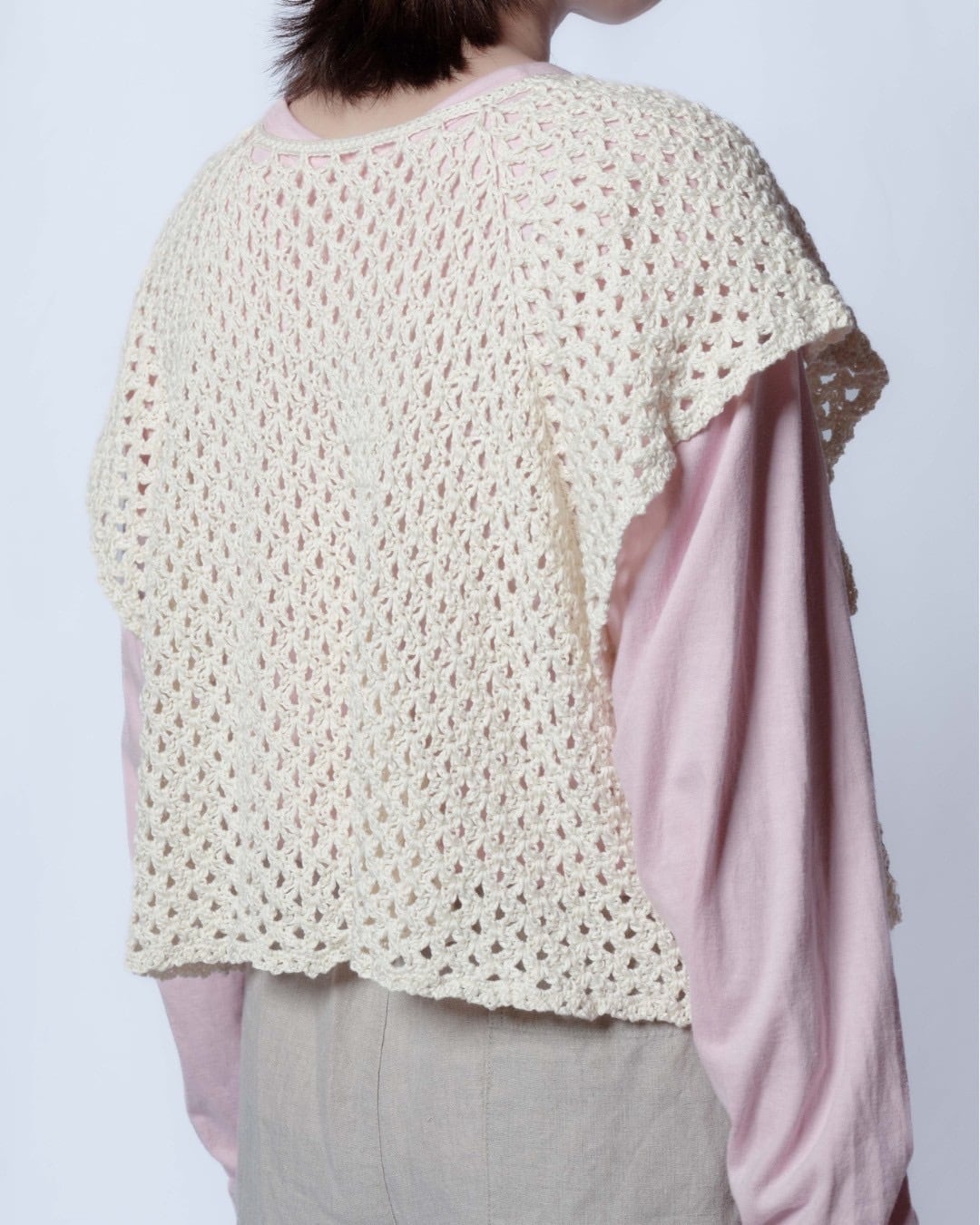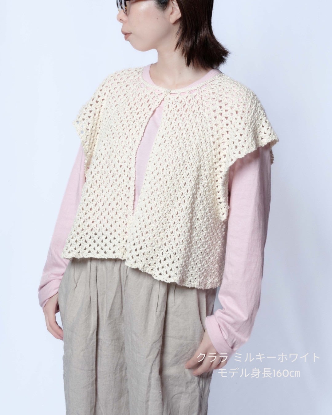 全体に広がる透かし編みと、光沢のある上質な糸「クララ」の組み合わせが、可愛らしさの中に上品さを感じさせます。