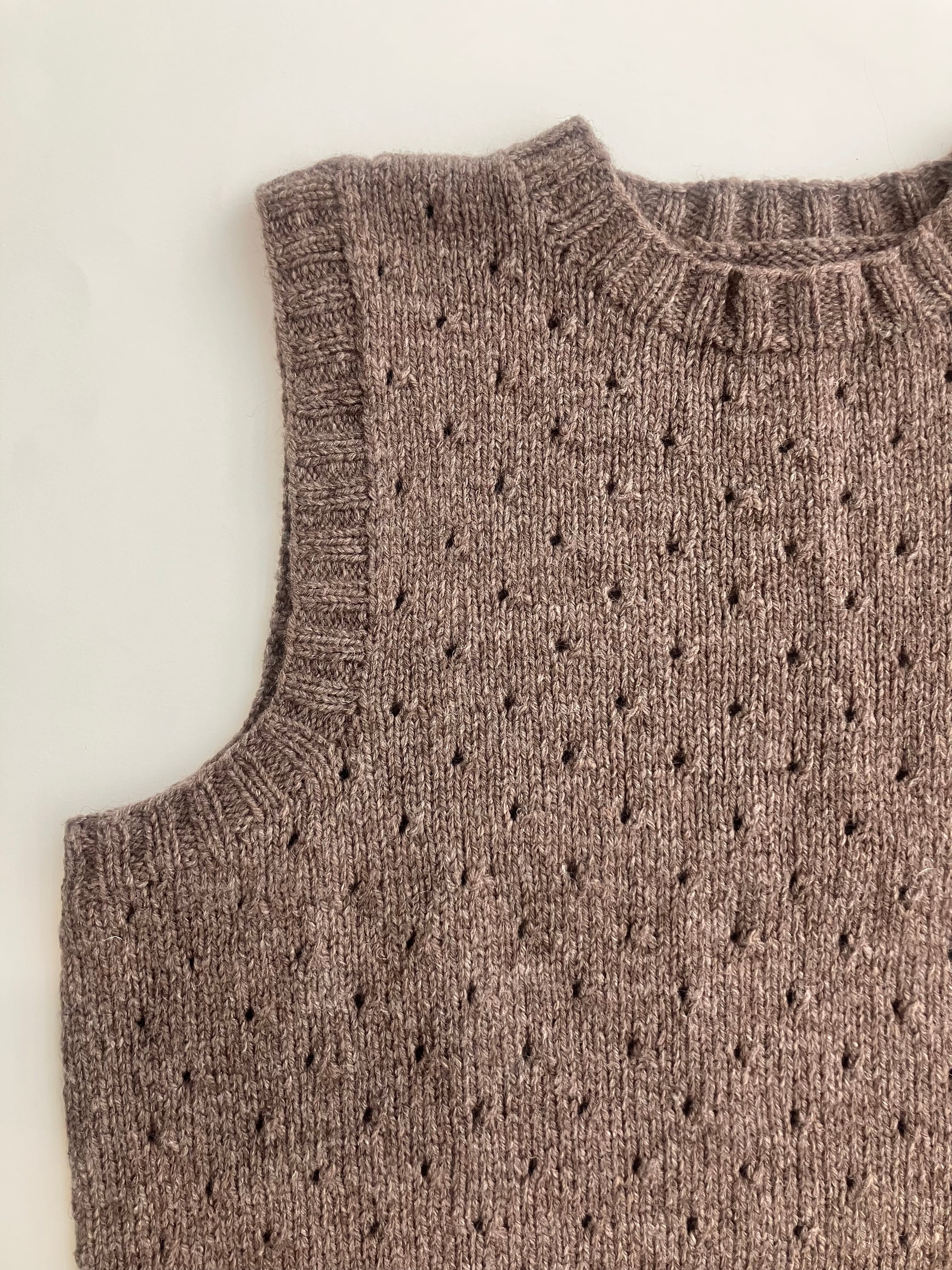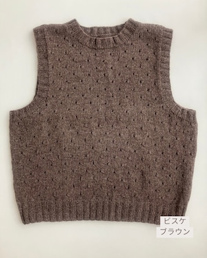 ビスケットの穴を思わせる小さなアイレット模様が並ぶ、棒針編みのシンプルなベスト。