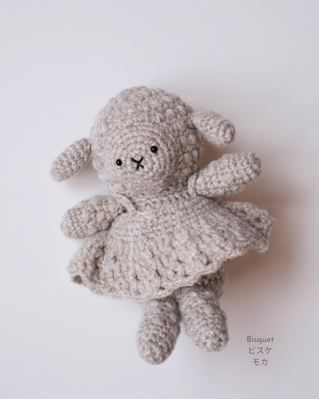 ひつじそのままの色で作られた毛糸「ビスケ」で編むひつじのあみぐるみ。