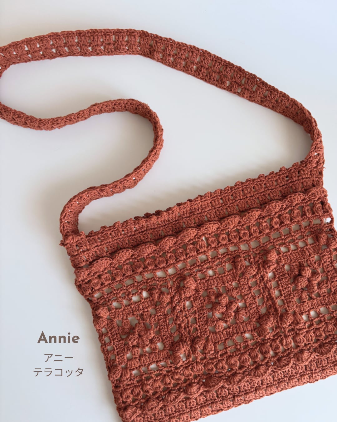 肌触りのよいコットン100%の糸「アニー」で編むので、あたたかい季節にも使えます。
