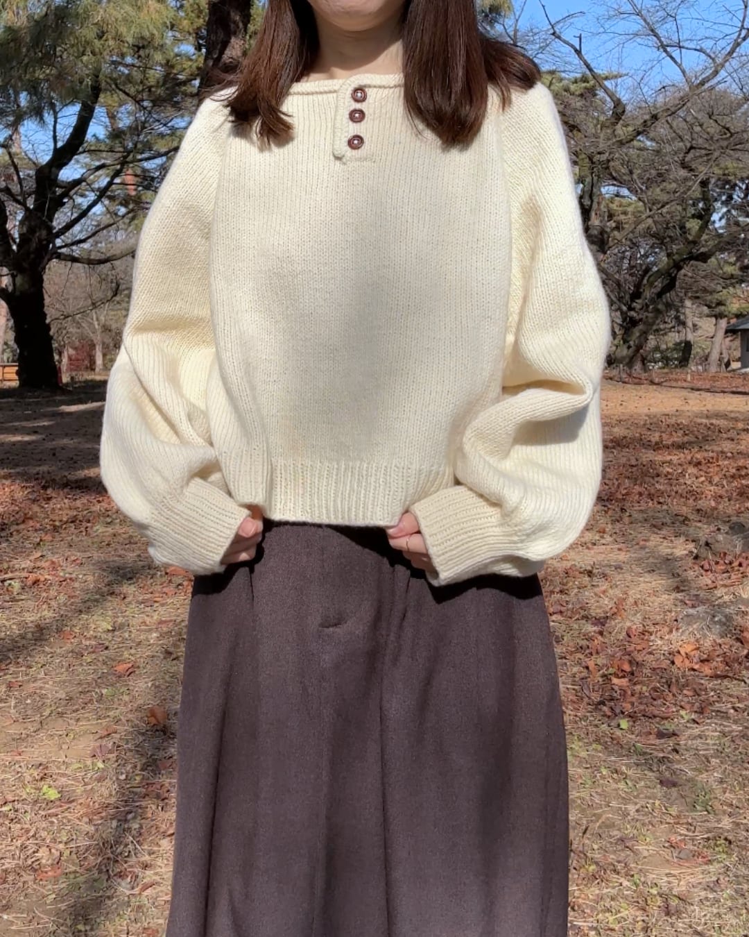 首元に三つ並んだボタンと、ぽわんとした形の袖が可愛いセーターです。