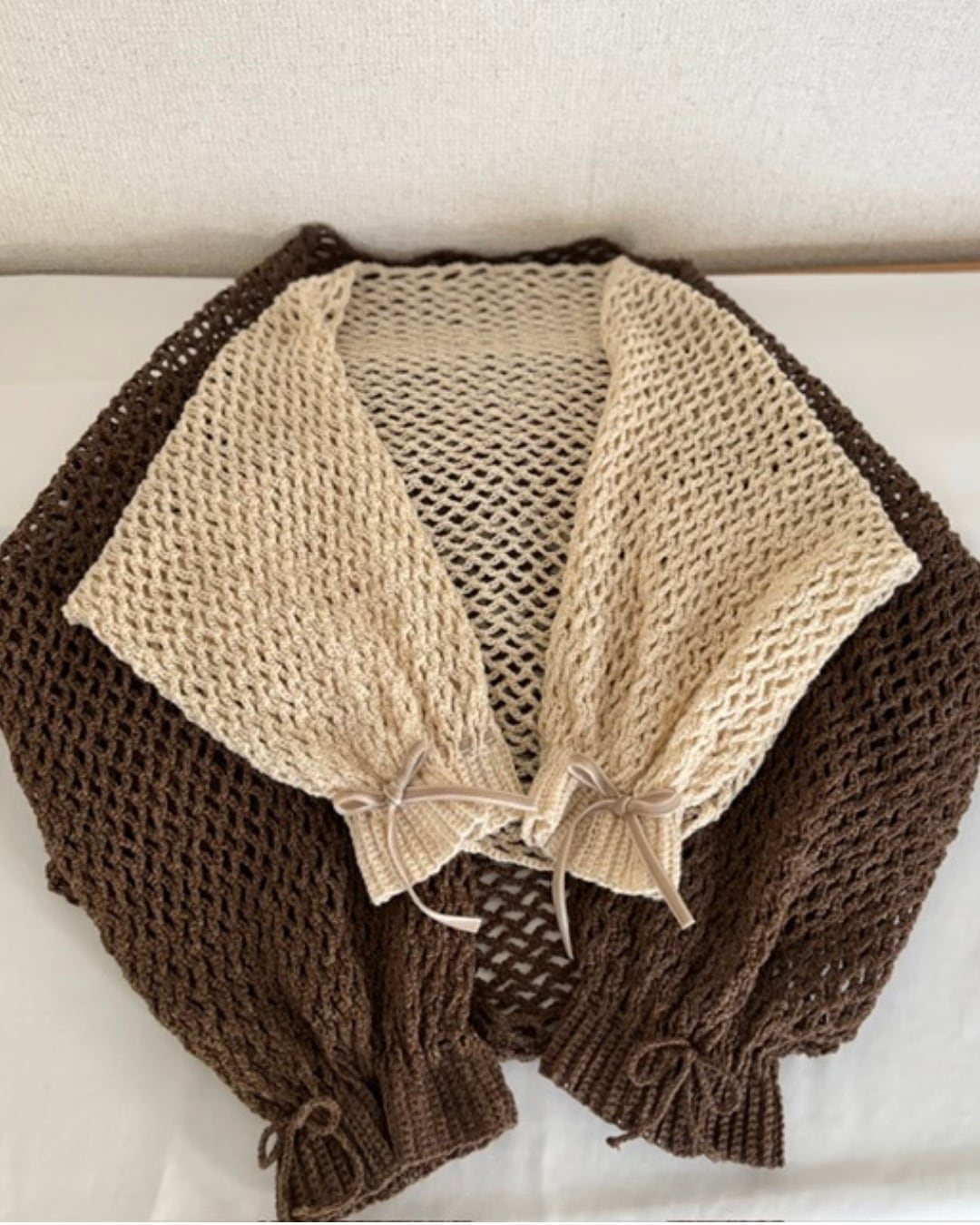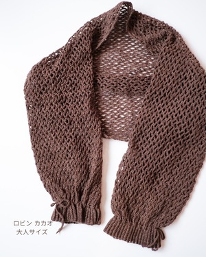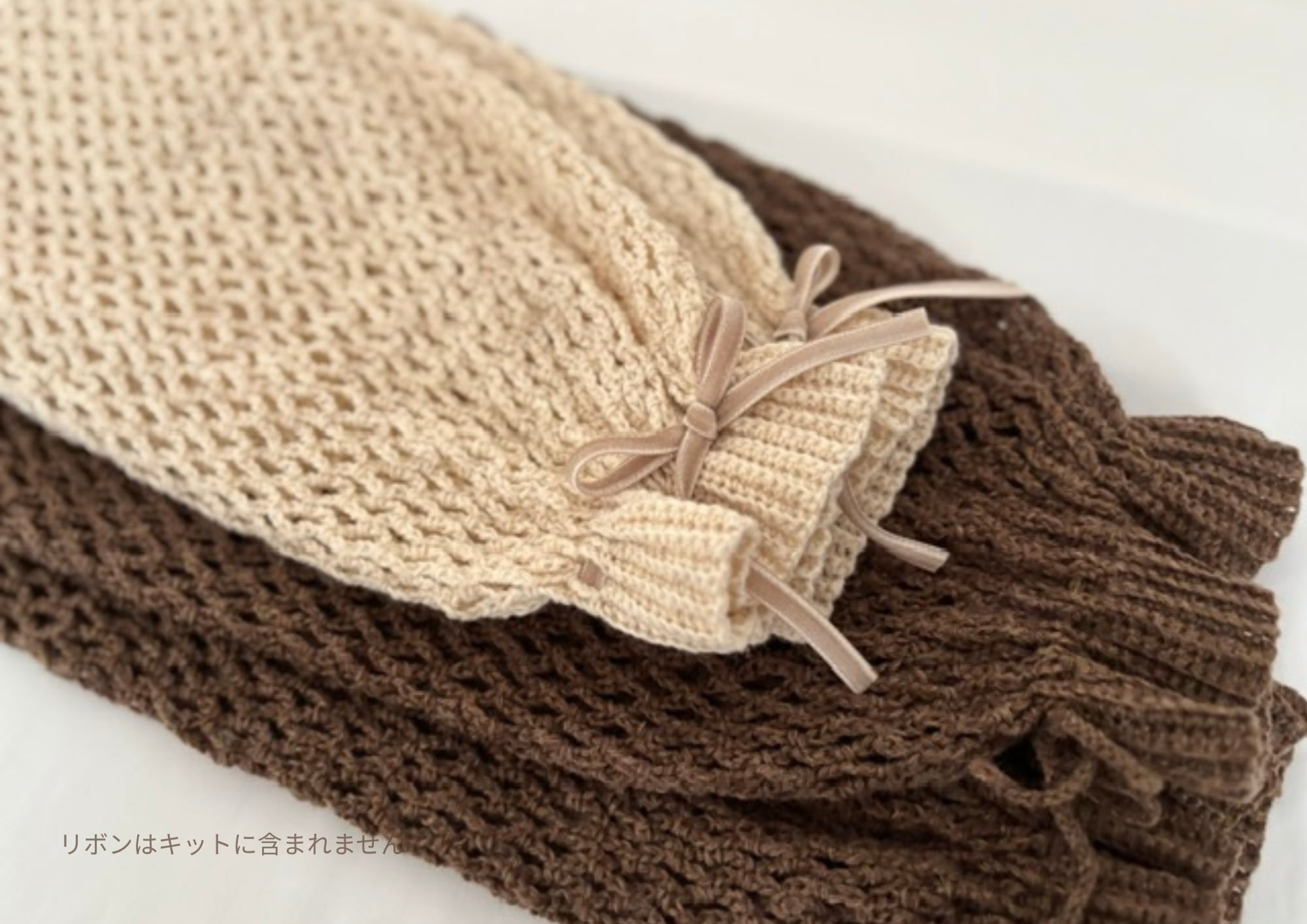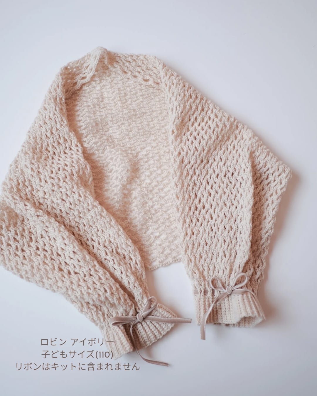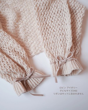 ※別途、編み針(かぎ針5/0号・かぎ針 6/0号)・メジャー・マーカー・袖口のリボン(50㎝)2本(お好みで鎖編み、エビコード、市販リボンなど)・はさみ・とじ針が必要です。