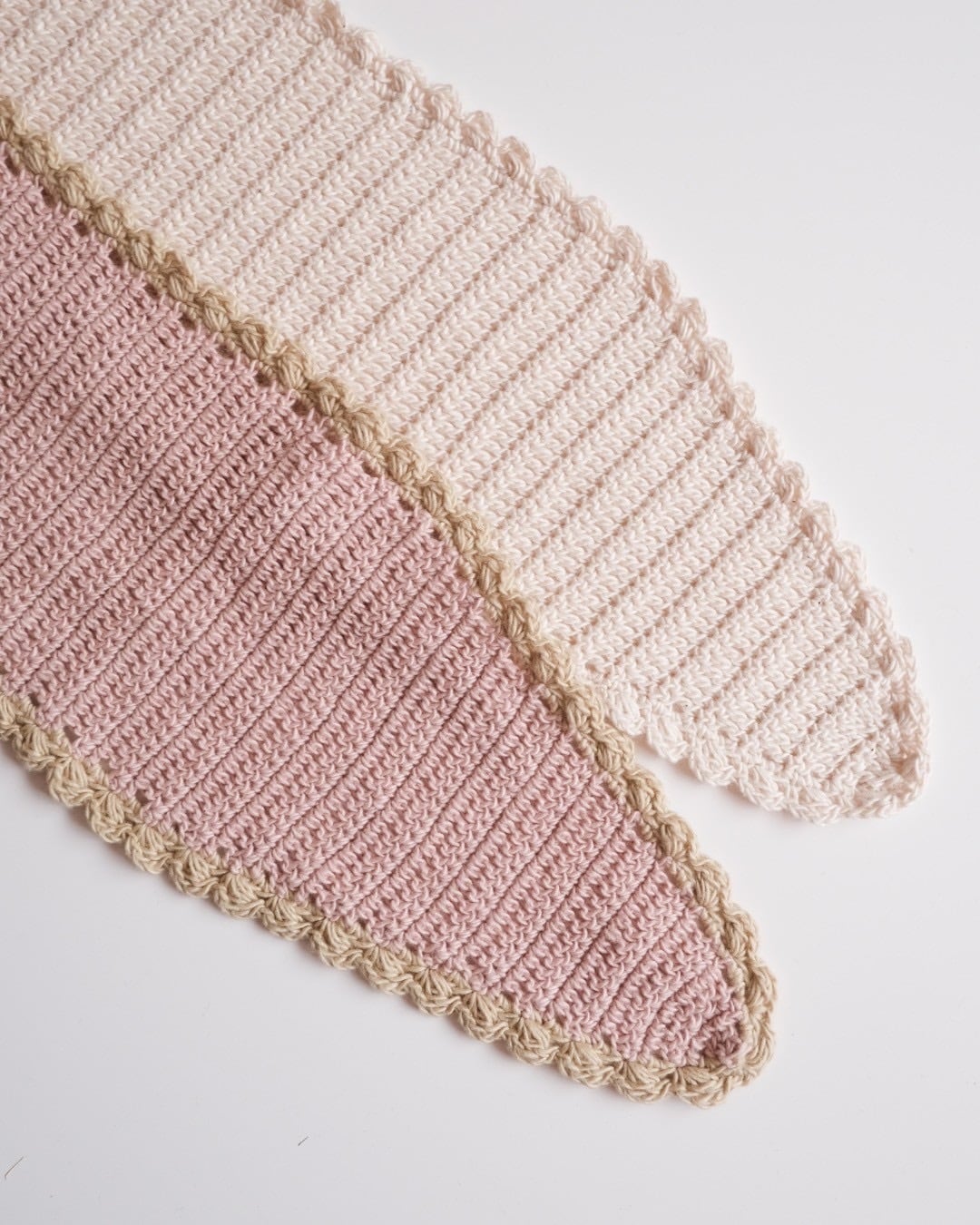 シンプルな三角の形に、やわらかなスカラップのふち編みをアクセントに。