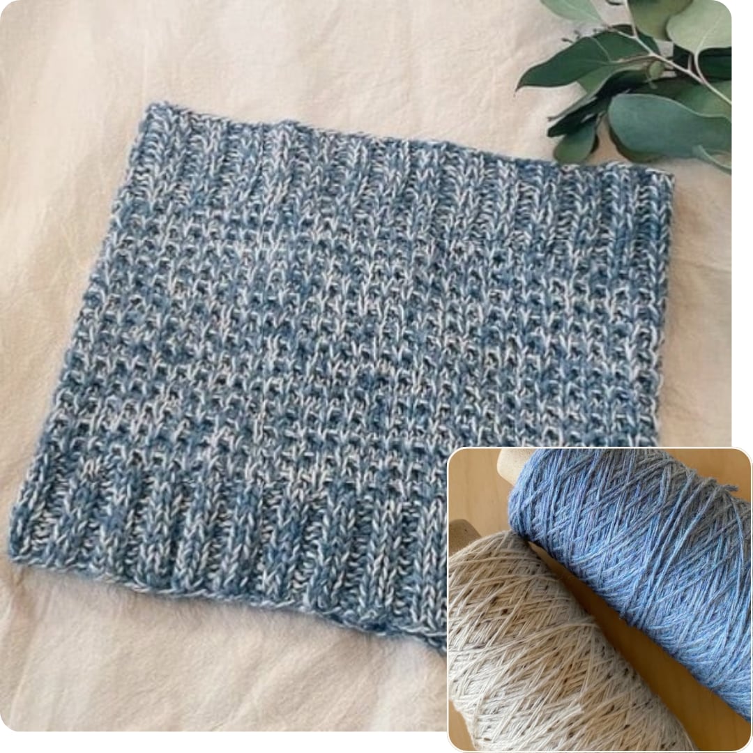 ムームとロビンを引き揃えて編むと、さらに表情豊かに、可愛らしい編み地になります。