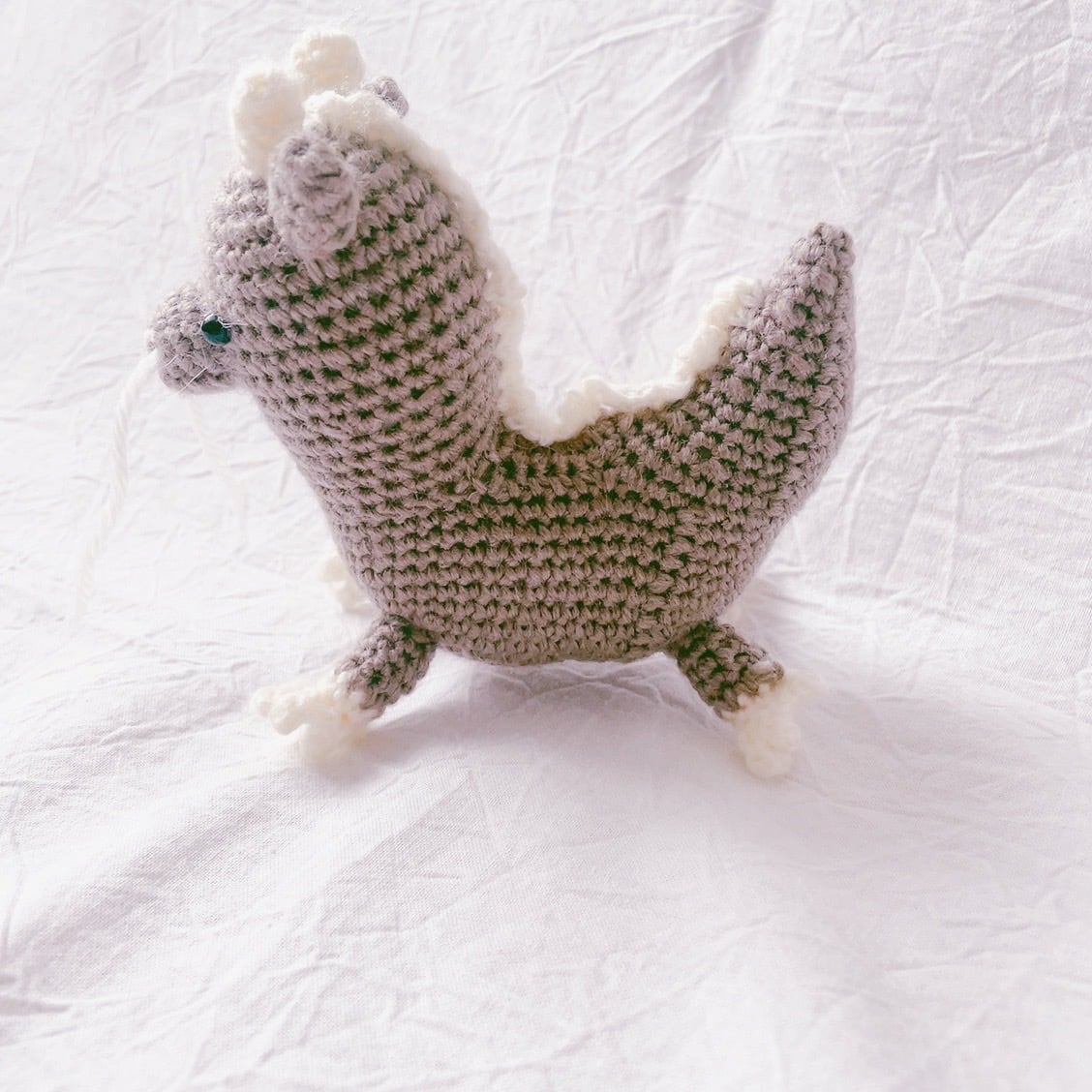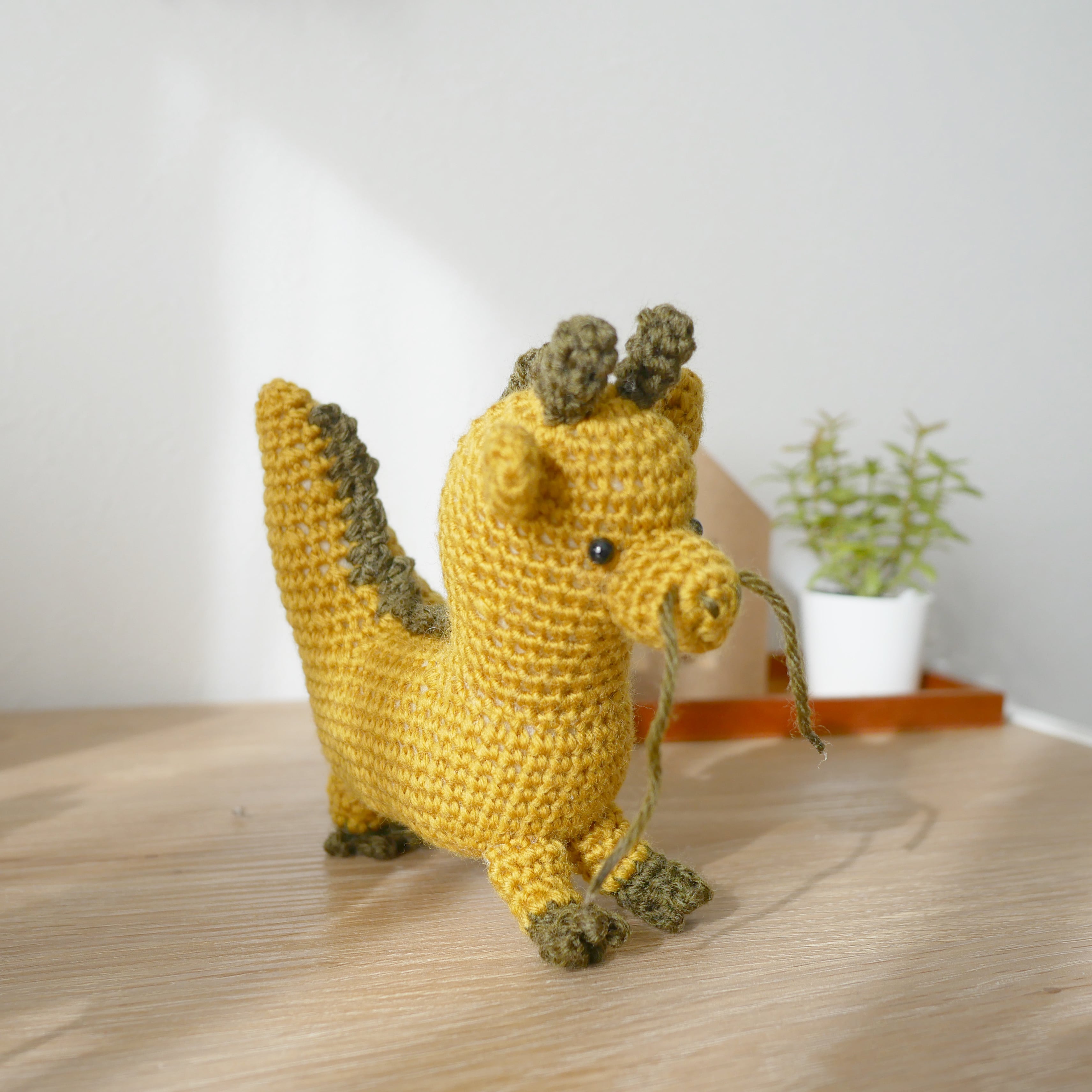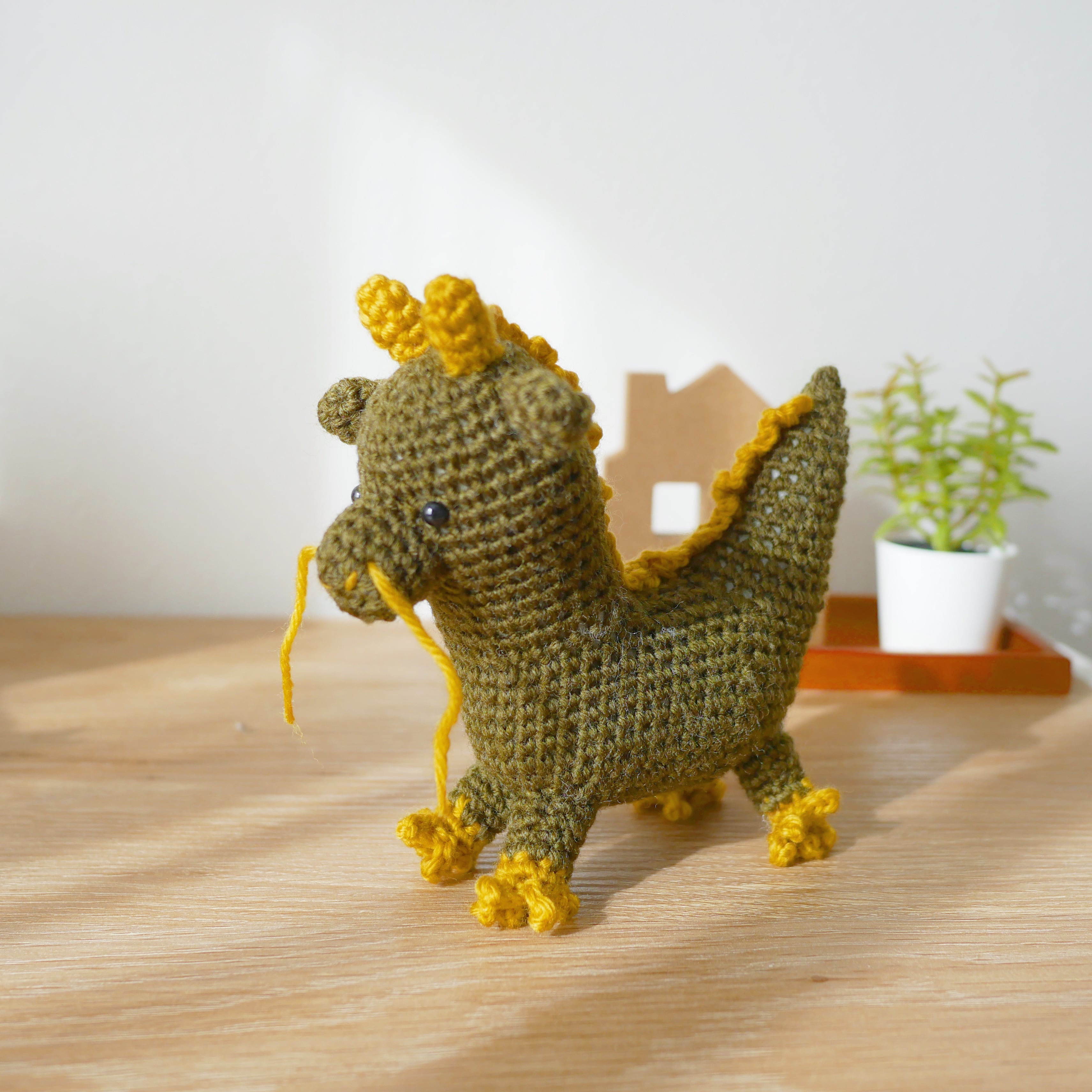 細長いボディに、ツノ、ヒゲ、タテガミのついた辰のロンロンのあみぐるみ。