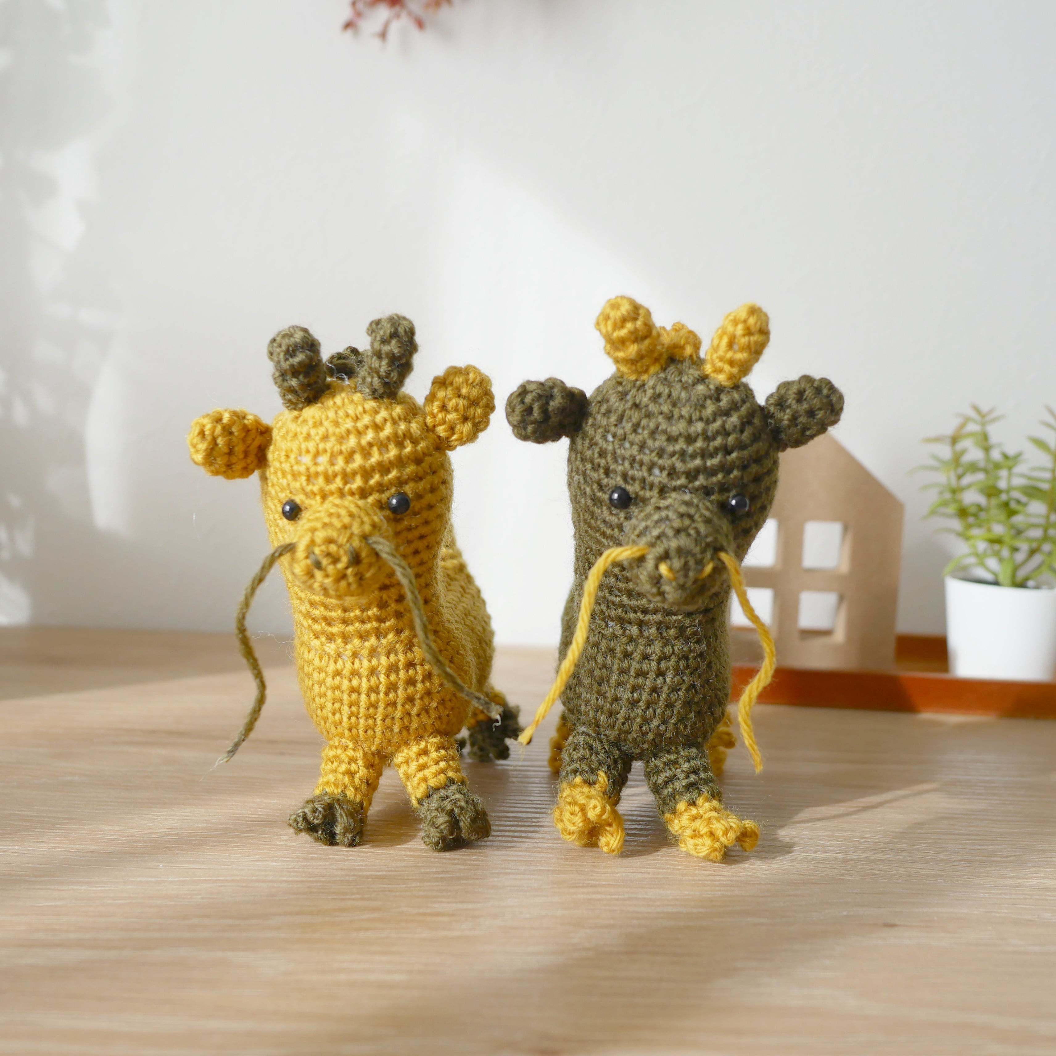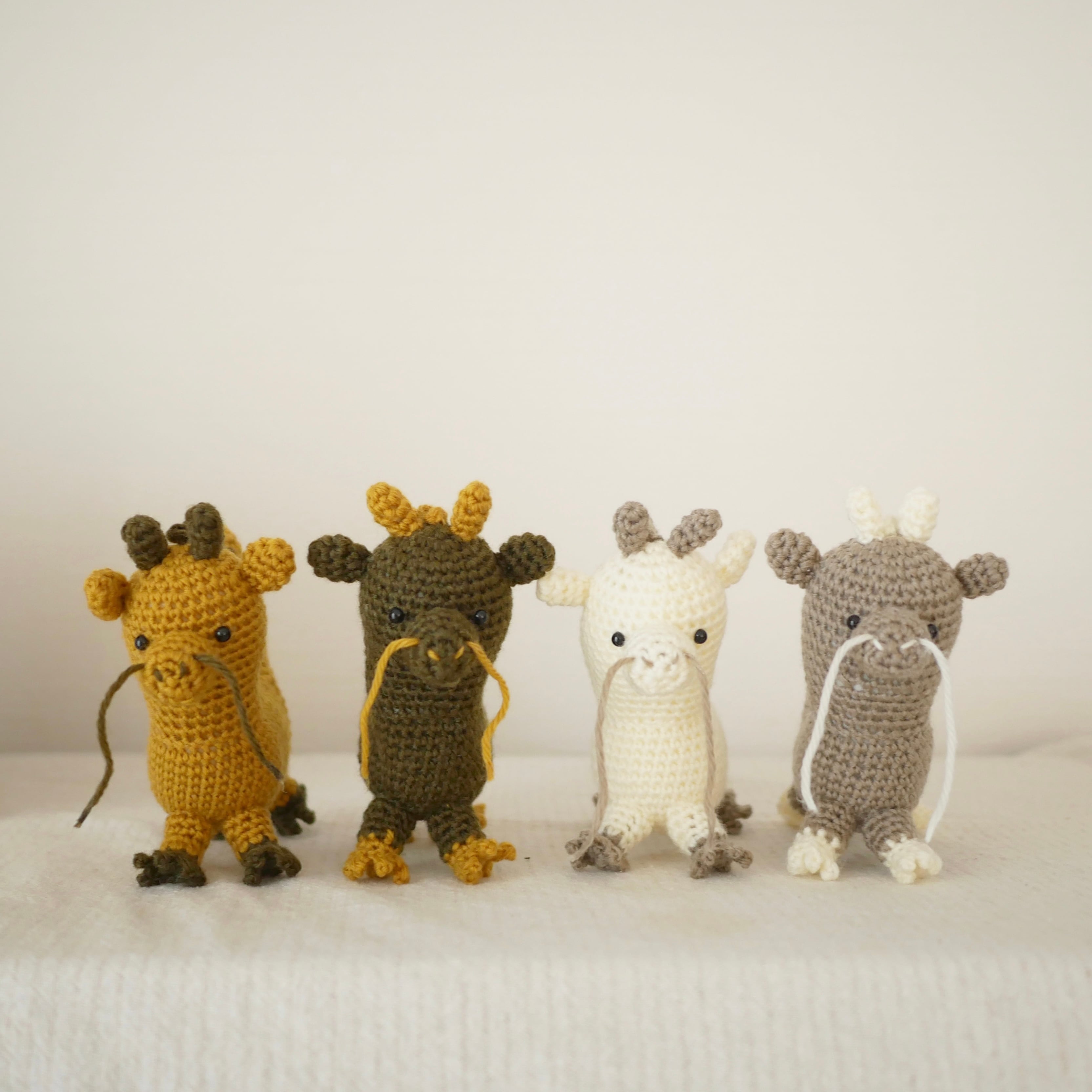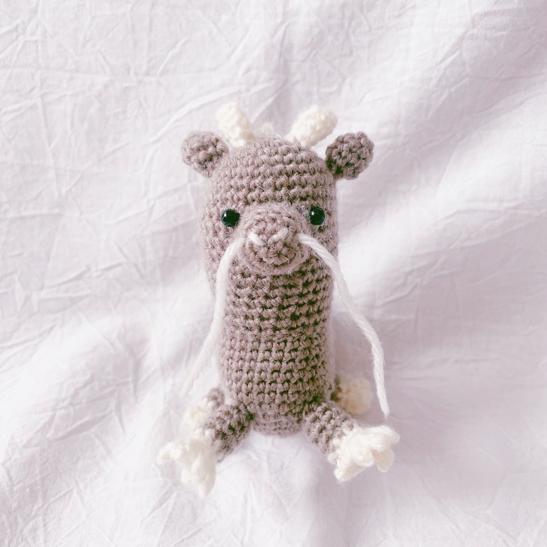 細長いボディに、ツノ、ヒゲ、タテガミのついた辰のロンロンのあみぐるみ。
