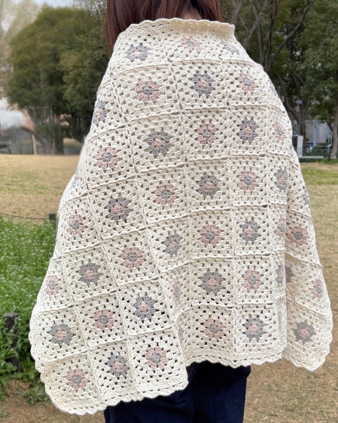 モチーフ1枚ごとのサイズを確認しながら、糸端を必要以上に長く取らないように編み進めることをおすすめいたします。